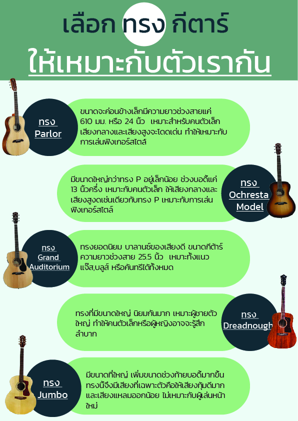 ปัญหาหนึ่งสำหรับมือใหม่เลยนั่นก็คือการที่จะต้องเลือกกีตาร์ให้เหมาะกับตัวขนาดเราเพื่อความสะดวกในการเล่นกีตาร์ถนัดมือเหมาะกับรูปร่างและได้เสียงตรงตามความต้องการ