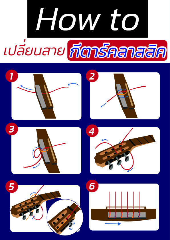 ขั้นตอนที่ 1 เตรียมสายกีตาร์คลาสสิค ในแต่ละยี่ห้อก็จะมีการมาร์คเพื่อบอกขนาดของแต่ละสาย จากนั้นนำสายสอดเข้าตรงรูฝั่งบริดจ์ แนะนำกะระยะเผื่อการมัดผันรอบด้วยนะครับ