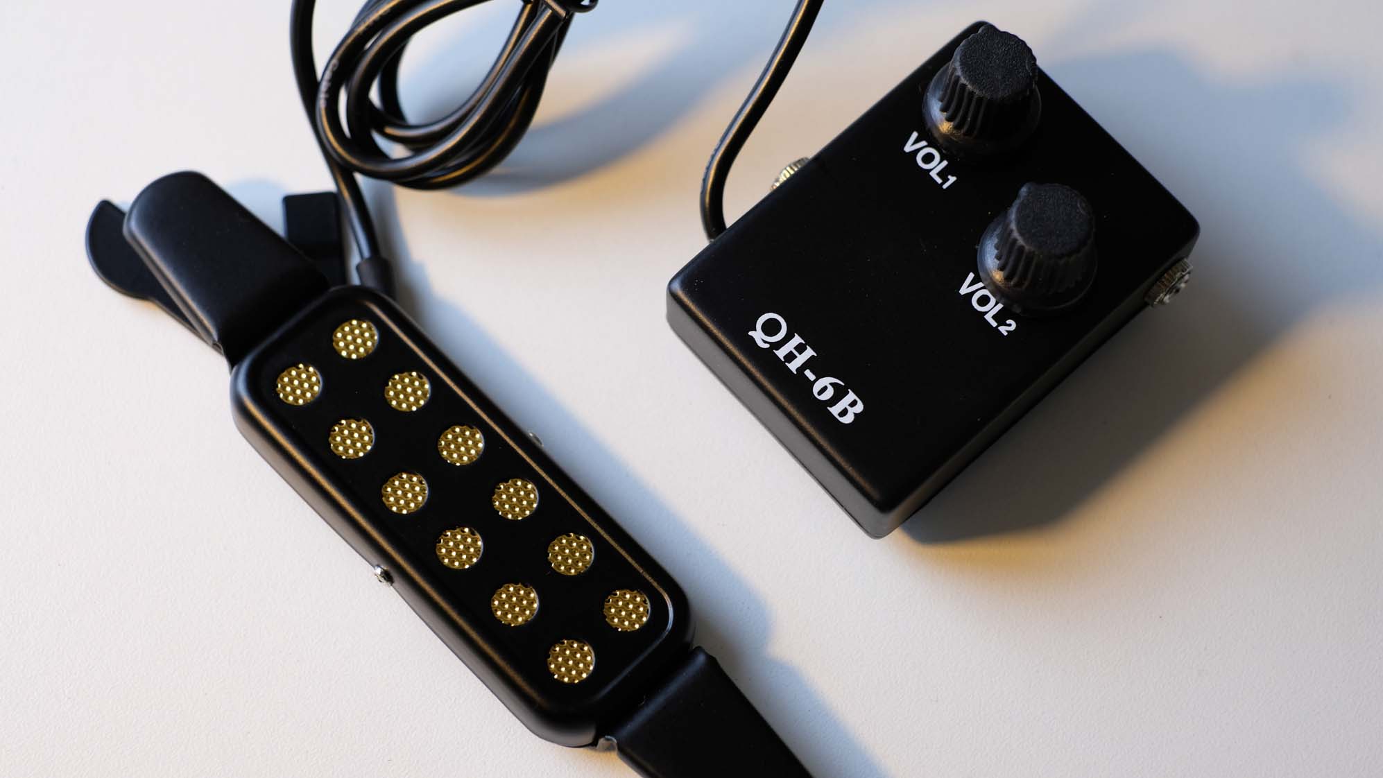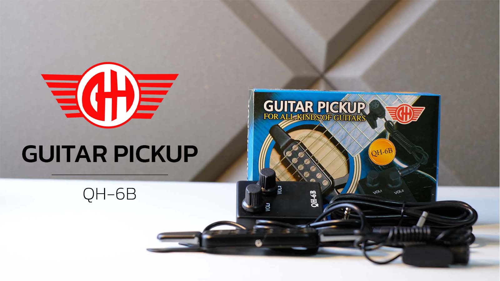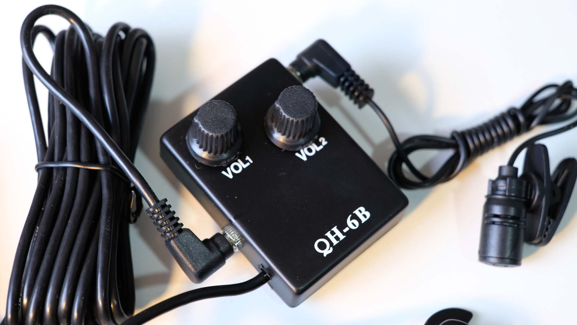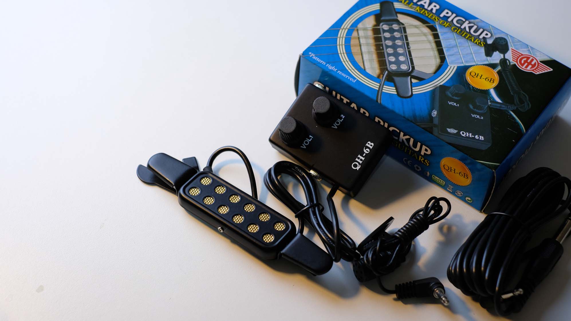 Product details of QH-6B 12-hole Magnetic Sound Hole Guitar Pickup Transducer Kit with Volume Controller Lapel Tie Clip Microphone Audio Cable for 38"/39"/40"/41" Acoustic Guitar This pickup set includes a magnetic pickup, a microphone and an audio cab