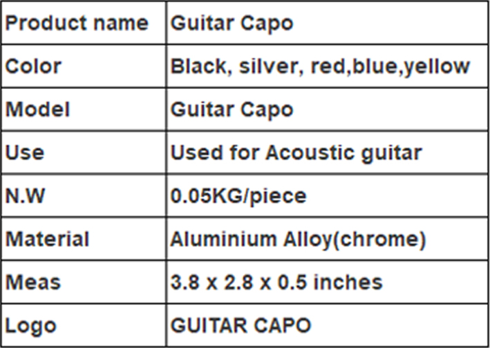ตัวคาโป้ ทำจาก อลูมิเนียม อัลลอย แข็งแรง ทนทาน ไม่เป็นสนิม แกนด้านใน เป็น Steel Spring เพิ่มความแข็งแรงในการหนีบจับ ขอบใน เป็น Green Rubber เป็นมิตรกับสิ่งแวดล้อม ที่สำคัญ ปลอดภัยกับตัวกีต้าร์ และมีความทนทานสูง