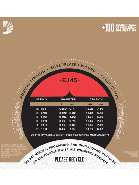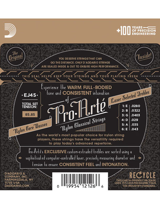EJ45, normal tension, is D'Addario's best-selling classical set, preferred for its balance of rich tone, comfortable feel and dynamic projection. All Pro-Arté treble strings are computer controlled by an X-Y laser micrometer which performs diameter and tension measurements, ensuring true-sounding, precise trebles in every set. Pro-Arté basses are wound using silver-plated copper on a multi-filament nylon core for consistent and warm, yet projecting tone.