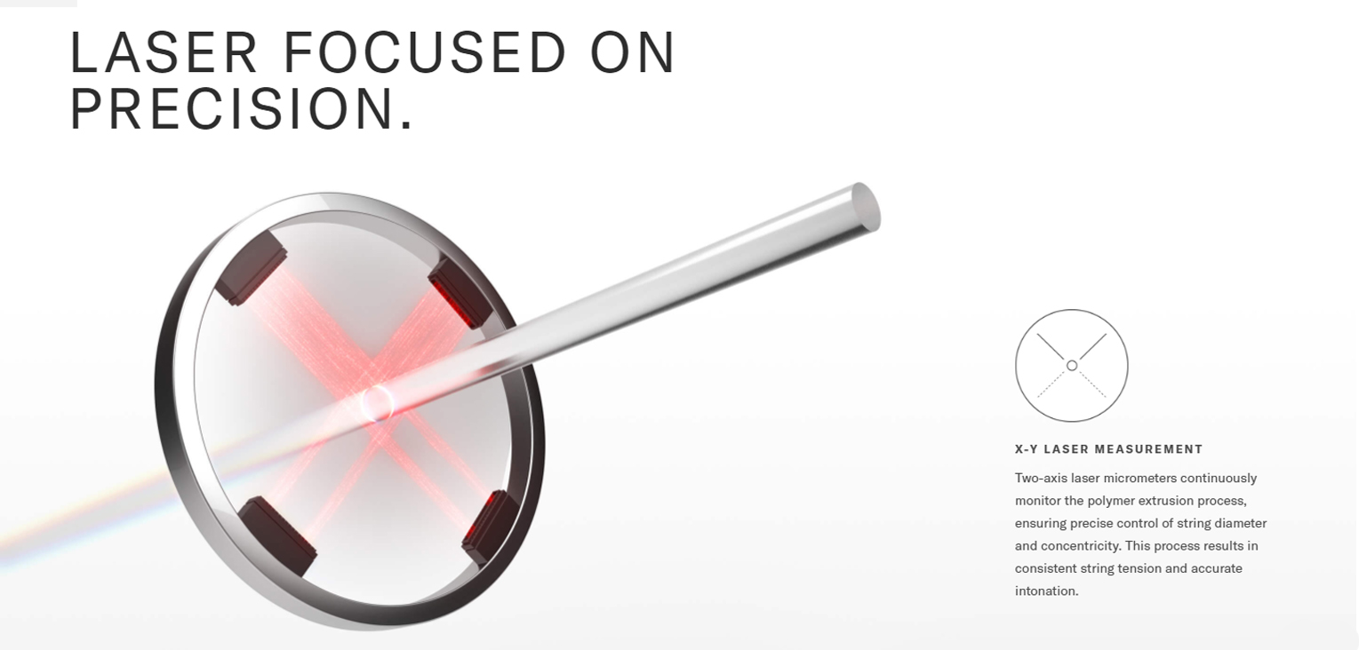 Laser controlled clear nylon treble strings for consistent, precise intonation