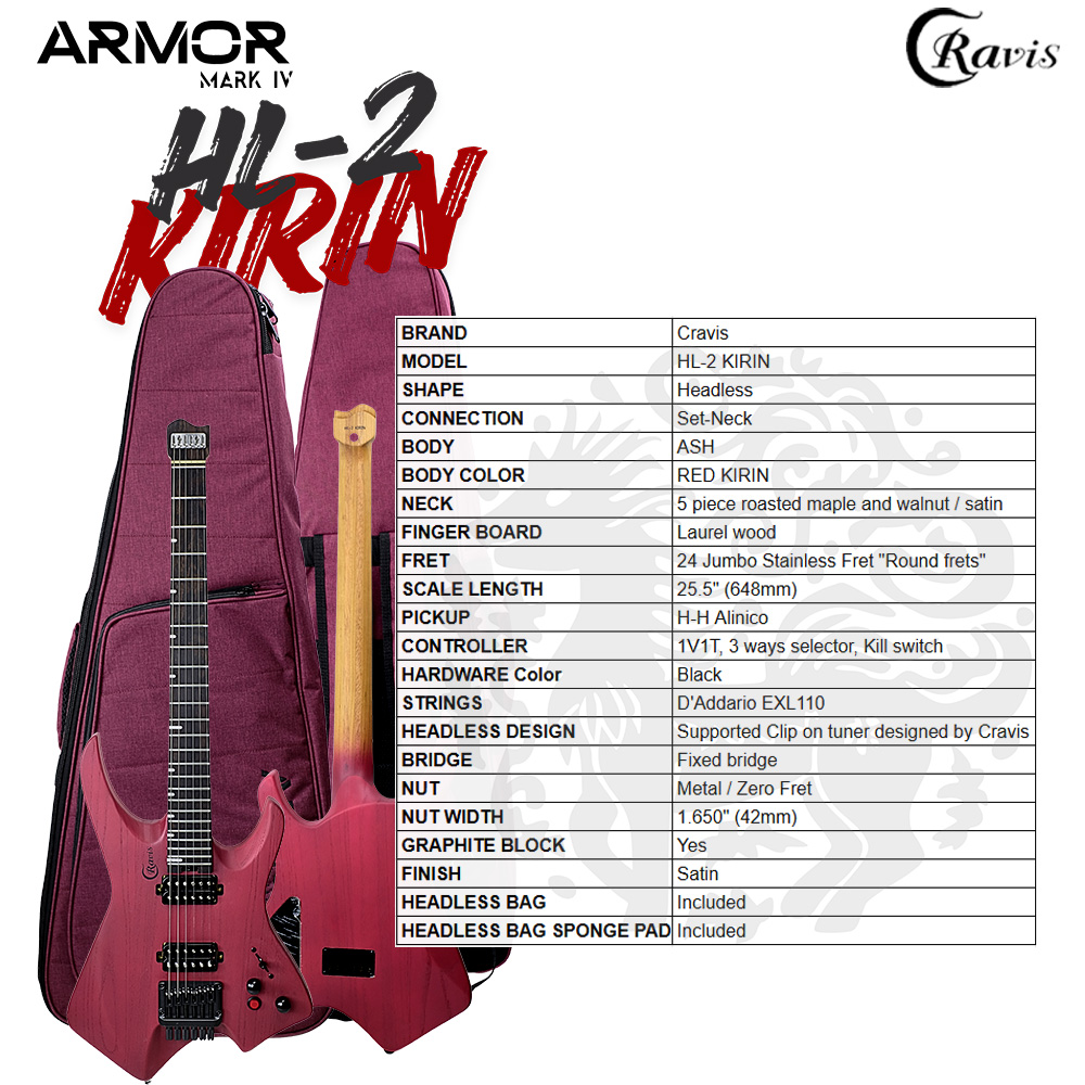 กีต้าร์ไฟฟ้าหัวตัด Cravis HL2-KIRIN รุ่นใหม่ล่าสุด ต่อยอดจากรุ่นก่อน (HL1) สีแดงเข้าชุดพร้อมกระเป๋า อัปเกรดบิดให้ปรับแต่งสายกีต้าร์ได้ง่ายยิ่งขึ้นพร้อมกับมาในรูปแบบเฟตมาตรฐาน ตัวเนื้อเฟตเป็นสเตนเลสจัมโบ้ ยังคงเอกลักษณ์ของ Cravis ไว้ด้วยระบบ Kill Switch ของกีต้าร์และการออกแบบหัวกีต้าร์ User friendly designใช้จูนเนอร์แบบหนีบได้อย่างสะดวกแม้จะเป็นกีต้าร์ทรงหัวตัดก็ตาม